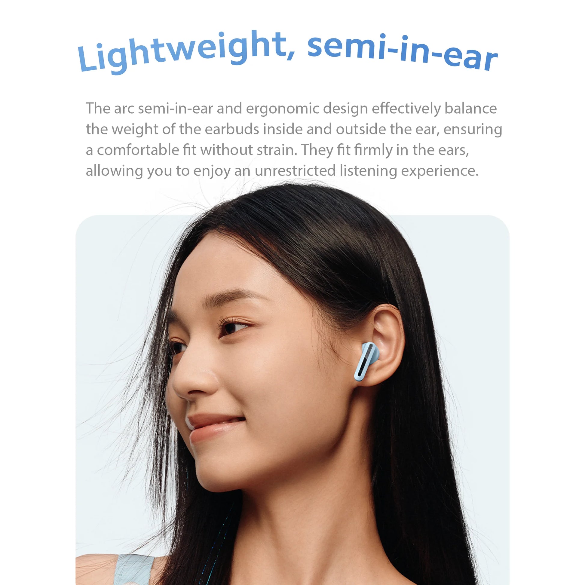 No burden on ears - Experience all-day comfort with the lightweight, semi-in-ear design. The ergonomic shape perfectly balances the earbuds inside and outside your ear, ensuring a secure fit with no strain. Enjoy unrestricted listening that feels as good as it sounds.
